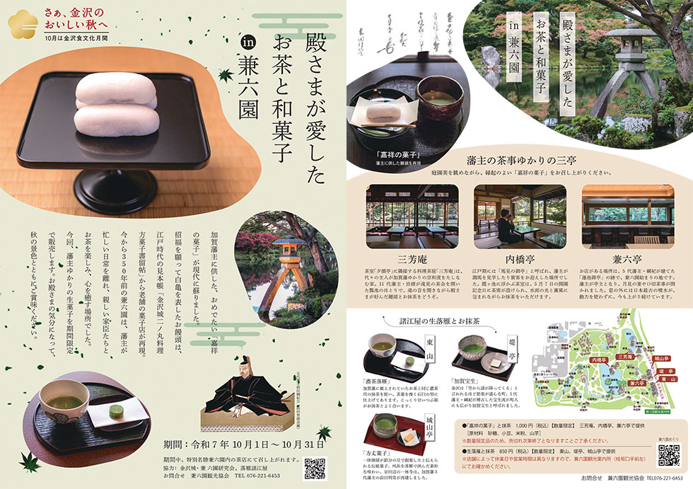 茶室「夕顔亭」に隣接する料理茶屋「三芳庵」は、代々の主人が加賀藩ゆかりの宗和流をたしなむお家。11代藩主・治脩が滝見の茶会を開いた池のほとりで、滝の音を聞きながらお茶を一服どうぞ。